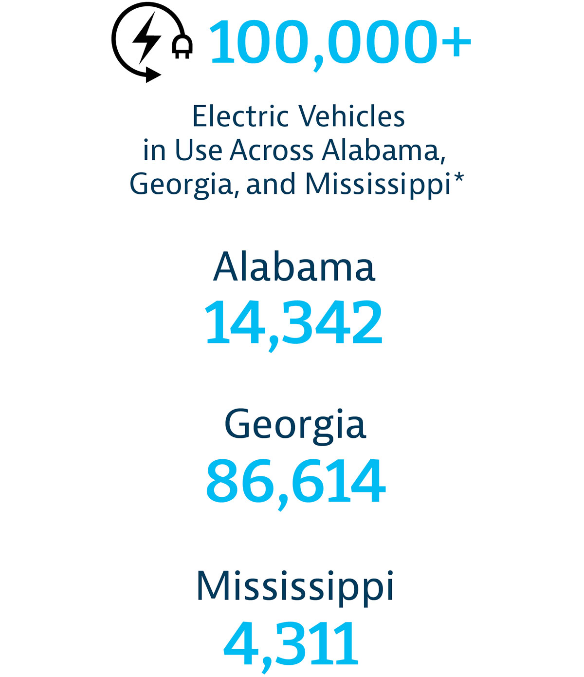 Across Georgia, Alabama and Mississippi, more than 100,000 electric vehicles* are in use. Southern Company is meeting the needs of our customers by expanding charging infrastructure and preparing the electric grid to serve the growing demand. At the same time, we’re also converting our own internal vehicle fleet and working with customers to build a better future through fleet sustainability.