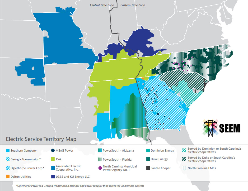 <p>Founding members of SEEM are expected to include Associated Electric Cooperative, Dalton Utilities, Dominion Energy South Carolina, Duke Energy Carolinas, Duke Energy Progress, ElectriCities of North Carolina, Georgia System Operations Corporation, Georgia Transmission Corporation, LG&E and KU Energy, MEAG Power, NCEMC, Oglethorpe Power Corp., PowerSouth, Santee Cooper, Southern Company, and TVA. Participation in SEEM is open to other entities that meet the appropriate requirements. Some utility commitments will take place following FERC approval.</p>