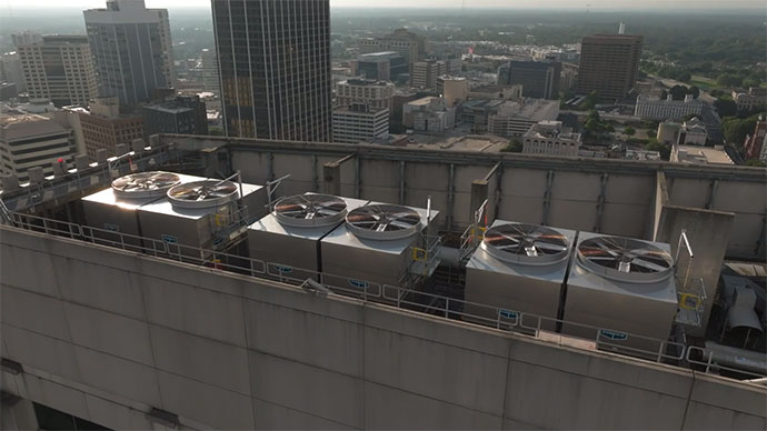 The airlift involved coordination with multiple entities, including the Atlanta Police Department for street closures in the vicinity, as well as a partial evacuation of neighboring buildings. Also in the loop for communications and notifications were the Atlanta Fire Department, Fulton County 911, MARTA, the Georgia Department of Transportation and the Atlanta Department of Transportation. A transport category Sikorsky S61N helicopter from Construction Helicopters was used to airlift the six massive cooling tower units and associated piping components. Tuscaloosa, Alabama-based McAbee Construction assisted with the lift and installation.