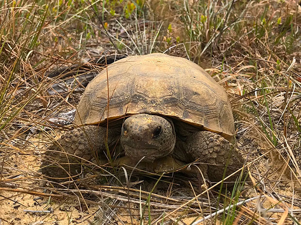 The gopher tortoise, another keystone species of the longleaf ecosystem, dig burrows in the sandy soil up to 15 feet deep and 40 feet long. These cavities provide shelter for 360 animal species, creating a safe harbor during forest fires.